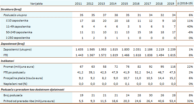 Tijekom 2020. godine provedeno je prikupljanje podataka o riboprerađivačkoj industriji Republike Hrvatske za 2018. i 2019. godinu. U 2019. godini u Hrvatskoj su djelovala 34 poduzeća s preradom ribe kao glavnom djelatnošću. Poduzeća su prema broju zaposlenika podijeljena u tri segmenta (1-10 zaposlenika, 11-49 zaposlenika, 50-249 zaposlenika), a najveći broj poduzeća (17) i najveći broj zaposlenih je u segmentu 50-249 zaposlenika. U segmentu 11-49 zaposlenika bilo je 7 poduzeća, a segmentu s manje od 10 zaposlenika 10 poduzeća. *